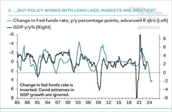 Finally, it is worth noting how significant the recent improvement in productivity is to the Fed, which wants to see increased participation rates and know that these workers are entering the workforce in a non-wage spiral inflation-accelerating way. Put another way, continued job creation does not need inflation-accelerating wage growth if new workers' unit labor cost is negative. Hence, the Fed can stop tightening even with an expanding labor market. Better productivity also supports harder data remaining resilient, such as factory orders and construction spending, as firms can weather any downturn better, as cooling input costs and higher productivity allow firms to navigate declining demand more effectively. Changing gears, it is also worth noting that higher rates, although punitive to many firms, especially smaller ones, can also be supportive given the general lack of leverage and credit demand currently due to the terming of debt taken and capex undertaken when rates were lower. Couple this with high levels of cash holdings, and nonfinancial firms have seen a decrease in their net interest expense.