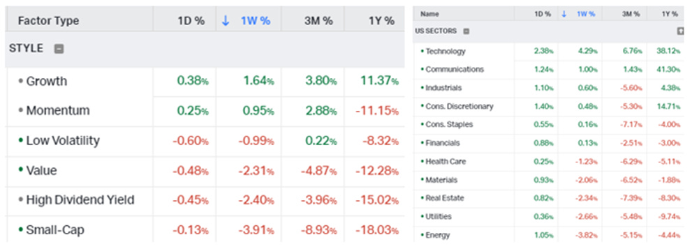 The Nasdaq outperformed the S&P and Russell on the week. Technology, Communications, and Industrials were the best-performing sectors, while Growth and Momentum were the best-performing factors. Large-cap growth was the best-performing size/factor combo.