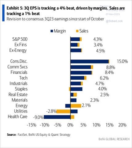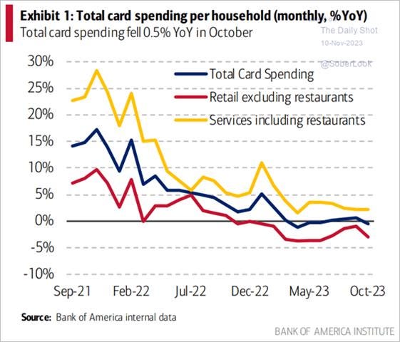 Turning to the positives first, third-quarter earnings grew at a near 3.7% pace, while revenue is on track to grow 2.3% from a year ago, according to FactSet. This was mainly driven by margins holding up better than expected, as firms generally noted a better ability to manage costs while still enjoying some pricing power on aggregate. Of course, individual sectors/industries are all experiencing this differently. On the other side, consumers saw real disposable income become positive and stabilize after being negative for much of the post-pandemic period. This supported spending as, despite job security weakening, the labor market remains tight by historical standards, allowing consumers to continue to drive growth. Although, as Fed officials are increasingly noting, there is a slowing in hiring, causing a better balance between demand and supply, an outright contraction through growing levels of layoffs seems unlikely to materialize into year-end. Moving forward, we would expect reduced spending on discretionaries like leisure and hospitality, but a still historically strong labor market, as seen during Q3, indicates a strong balance sheet and stable real disposable income story for Main Street may still have legs. Yes, access to credit is becoming harder and more expensive. Still, as this week's Fed data showed (highlighted in the “Policy Talk’ section), lending standards are changing more unevenly, with lower income/credit-scored individuals being hit hardest, while middle and higher income cohorts have seen greater stabilization or even loosening. Renewed rises in financial markets have also improved sentiment through the wealth effect channel. Further, the cost of gas is falling, freeing up disposable income. This will be offset by some of the drag from higher childcare costs and a resumption of student debt payments, but overall, it should support retail sales during the holiday season, especially for lower-income households.