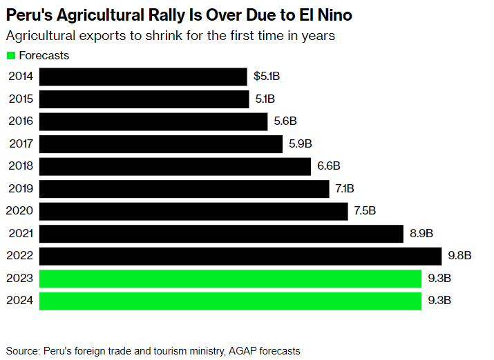 Moderate Intensity: Peru’s agricultural exporters are bracing for tough times as a second year of bad weather upends a prolonged period of growth that turned the Andean nation into a fruit and vegetable powerhouse. The El Nino weather phenomenon means revenue from farm shipments probably will shrink 5% this year and stay flat next year, said Gabriel Amaro, head of agribusiness group AGAP. That’s a trend breaker in an industry that grew through the depths of the pandemic and when El Nino last struck in 2017. The uninterrupted expansion made Peru the top exporter of grapes and blueberries and among the biggest suppliers of mangoes, asparagus, and avocados. - El Nino Is Set to Put an End to Peru's Long Run of Fruit Export Growth - Bloomberg