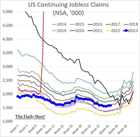 Done So Well: The economy is still generating jobs, but the job market is moderating but not buckling, a message reinforced by a variety of data, including low levels of weekly unemployment claims and layoffs. This wasn’t the sort of job market the Fed expected. When policy makers offered projections last December, they forecast that the unemployment rate would average 4.6% in this year’s fourth quarter. Economists got it wrong, too. They put the chances of a recession within the next 12 months at 63%. By last month, they dropped the recession chance to 48%. The jury is out on what happens next. The cooling in the job market could turn into a lurch lower, for example, as the full effect of the Fed’s past rate increases begins to take hold. But the chances of the economy avoiding a recession seem stronger now than they did even a few months ago. - The Improbably Strong Economy – WSJ