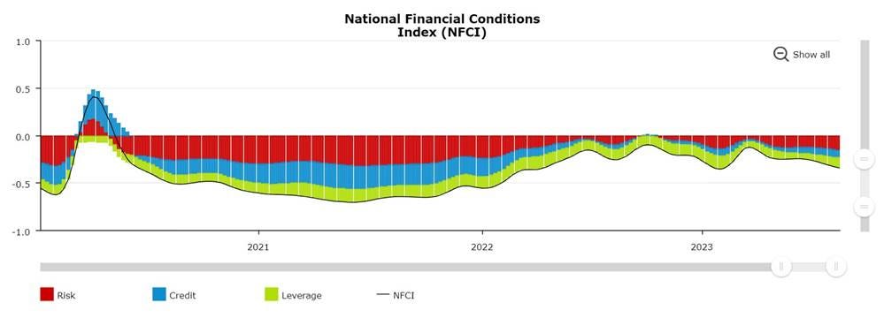 The National Financial Conditions Index (NFCI) ticked down to -0.36 in the week ending November 3, suggesting financial conditions loosened. Risk indicators contributed –0.16, credit indicators contributed –0.09, and leverage indicators contributed –0.10 to the index in the latest week.