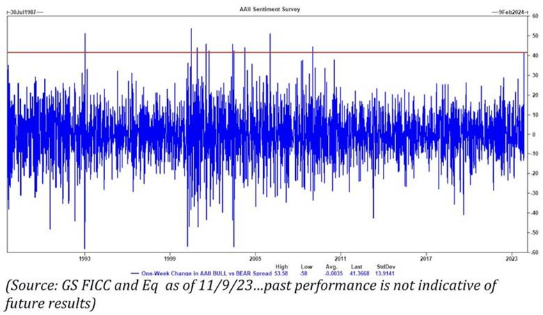 AAII sentiment: "Bulls now at 42.6% (vs 24.3% last week) and Bears now at 27.2% (vs. 50.3% last week)...The one-week positive change in the Bull-Bear spread is the largest since January 2009." - Goldman Sachs