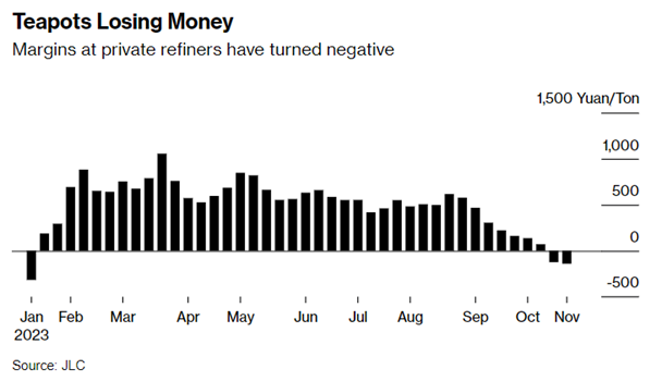 Inflection: The oil demand outlook in China, the world’s biggest importer, isn’t offering much inspiration to bulls as the end of the year approaches. Refining margins are falling, crude and fuel stockpiles are building, and a hoped-for sharp jump in air travel still hasn’t eventuated. That’s mirroring the situation in the wider economy, where business and consumer confidence remain low despite government efforts to juice growth. - China’s Oil Demand Outlook Is Worsening as Winter Approaches - Bloomberg