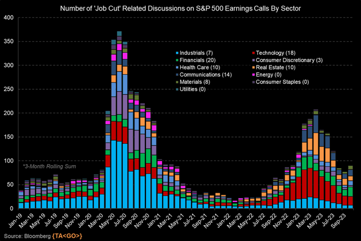 An analysis of S&P 500 earnings calls reveals the number of discussions related to 'job cuts' across different sectors. Financials and Technology are leading the conversations - @M_McDonough