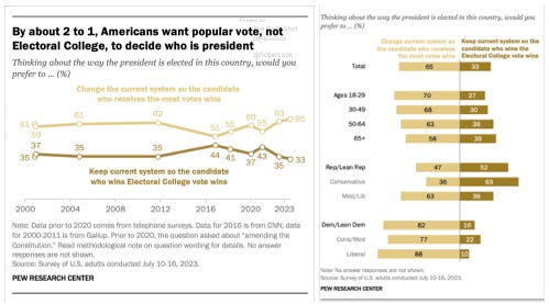 Change the System: Nearly two-thirds of U.S. adults (65%) say the way the president is elected should be changed so that the winner of the popular vote nationwide wins the presidency. A third favor keeping the current Electoral College system. Democrats and Democratic-leaning independents are far more likely than Republicans and Republican leaners to support moving to a popular vote system for presidential elections (82% vs. 47%). Ideological differences are wider among Republicans. A clear majority – 63% – of conservative Republicans prefer keeping the current system, while 36% would change it. - Majority of Americans continue to favor moving away from Electoral College – Pew Research