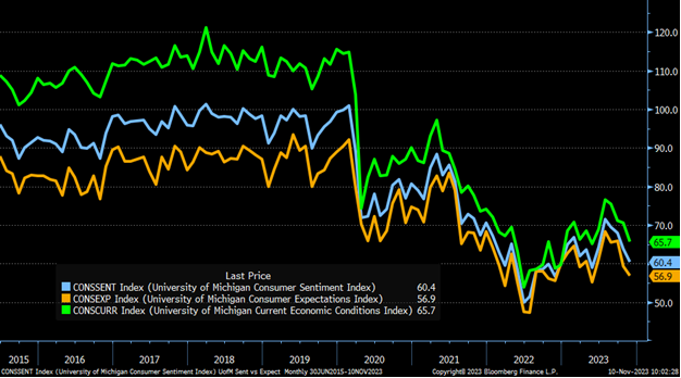Key Takeaways: This was the lowest reading in six months, mainly due to growing concerns about the negative effects of higher interest rates and the ongoing wars in Gaza and Ukraine. “Overall, lower-income consumers and younger consumers exhibited the strongest declines in sentiment. In contrast, the sentiment of the top tercile of stockholders improved 10%, reflecting the recent strengthening in equity markets,” said Survey Director Joanne Hsu. The higher reading in inflation expectations mainly came from Republican-leaning respondents (4.9% one year ahead), while Independents were flat (4.3%), and Democrats continued to trend lower (2.4%). This was driven by gas price expectations, both over the short and long run, rising to their highest readings this year despite recent notable decreases in prices at the pump. In the final November report, we may see some notable revisions (improvements in sentiment and decreases in inflation expectations) as Republican drivers see increasing levels of $2-handle gas prices on the road and the situation in the Middle East potentially stabilizes.