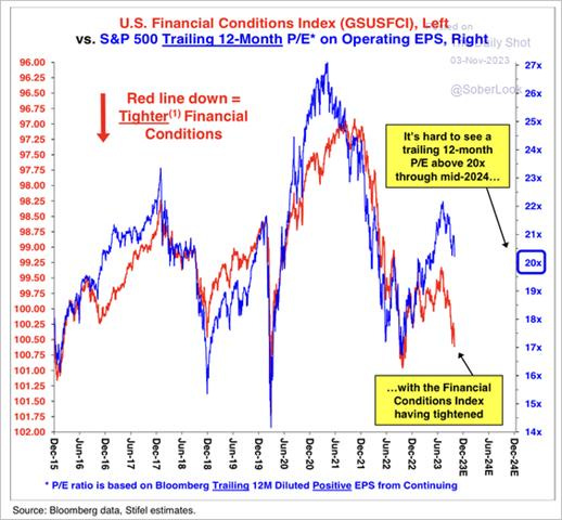 Tighter financial conditions should increasingly weigh on the S&P 500 over time.