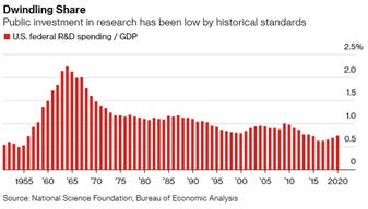Federal money for research and development, as a share of the economy, has been at historically low levels. But President Joe Biden has made support for innovation a key part of his program, calling for increased funding to key industries like semiconductor manufacturing, cybersecurity, and electric vehicles. And Congress is moving toward a wide-ranging plan, with backing in both parties, that could inject about $190 billion into new and existing programs.