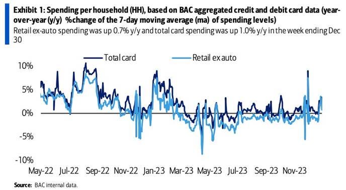 “Total card spending per HH was up 1.0% y/y in the week ending Dec 30, according to BAC aggregated credit and debit card data. Spending on holiday items fell 1.3% y/y in the week ending Dec 30. ... However, in the five weeks since Thanksgiving, spending on holiday items was up 0.3% compared to the same period last year.” - BofA