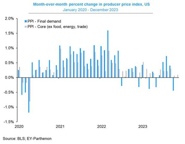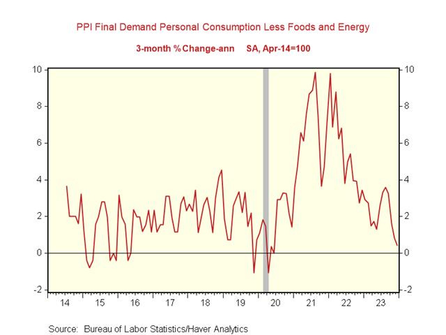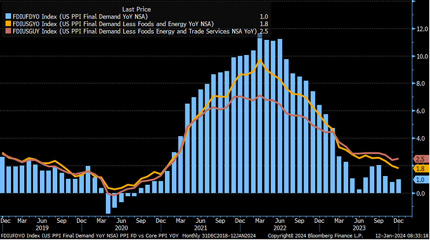 Key Takeaways: At the headline level, December’s PPI report is supportive that disinflationary progress continues for the Fed. Final demand for goods dropped for a third consecutive month, mainly due to a -12.4% fall in prices for diesel fuel, while gasoline prices were up 2.1%. Most of the December decrease in processed goods for intermediate demand can also be attributed to the decline in diesel fuel, too. Further, over 80% of the decrease in unprocessed goods for intermediate demand can be attributed to a -13.2% decline in the price of crude oil. Meanwhile, prices for services were unchanged, the same as in the previous two months. However, when excluding trade services, the annual rate increased to 2.9%, and when excluding distributive services, the annual rate was 3.6%. This indicates that there is still some stickiness in other final demand services prices. Further, with international shipping costs rising, it's possible that some logistical cost firmness may occur, especially if firms replenish low inventory stocks more aggressively than expected. All in all, recent stabilization in energy prices (due to geopolitical risks) and greater inventory restocking pressures may see recent PPI weakness reverse. Regarding the PPI inputs into PCE, it is clear that changes in core PCE in December will be weaker than core CPI, with sell-side research estimating core PCE will rise 0.2% MoM due to what core PPI final demand personal consumption indicates.