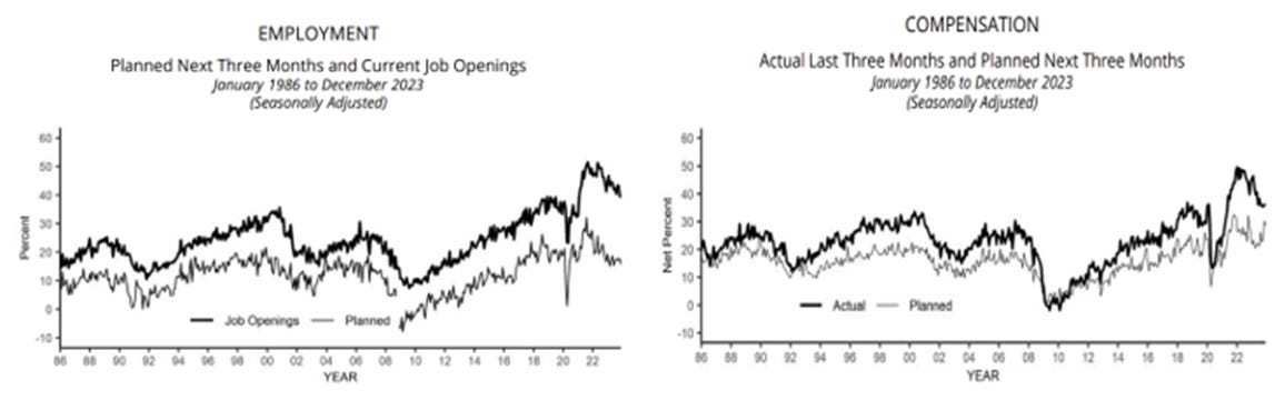 Inflation: 25% of owners raised selling prices, unchanged from November. Unadjusted, 15% (up 1 point) reported lower average selling prices, and 36% (unchanged) reported higher average prices. Price hikes were most frequent in finance, retail, construction, and services. Seasonally adjusted, 32% plan price hikes, down 2 points.