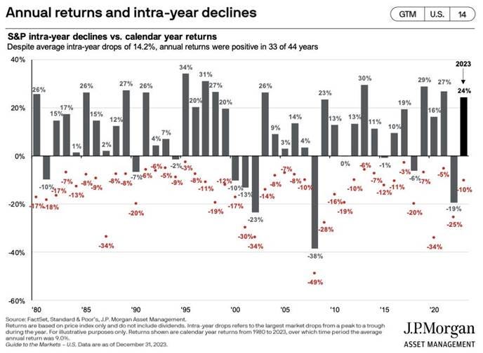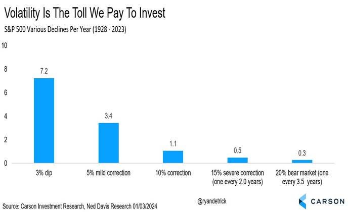 In an average year, the S&P sees at least seven separate dips of at least 3%, three separate pullbacks of at least 5%, and one correction of at least 10%. - Carson Group’s Ryan Detrick
