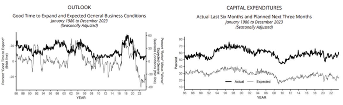 Capital Spending and Credit: 58% of owners reported capital outlays in the last six months, down 3 points from November. Of those making expenditures, 40% reported spending on new equipment (down 1 point), 22% acquired new vehicles (down 1 point), and 19% improved or expanded facilities (up 2 points). 24% percent plan capital outlays in the next few months, up 1 point. 3% of owners reported all borrowing needs unsatisfied (down 1 point), while 25% reported all credit needs met (unchanged), and 61% said they were not interested in a loan (down 2 points).