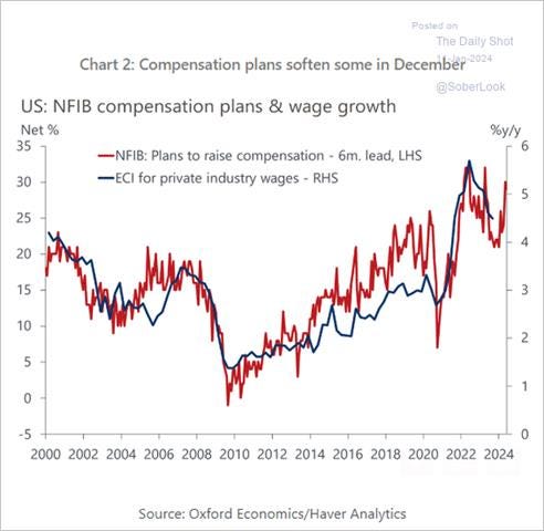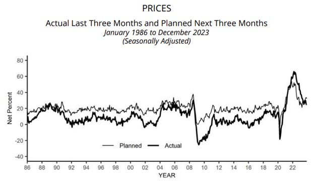 As a result of our above points, and with full respect to the current price action, which has weighed on our mock portfolio returns, we still have a bias towards being short equities and long the dollar at this current juncture. We see Treasury yields in the middle of our expected H1 ‘24 range, providing less of a tactical trading opportunity. When looking at the totality of inflation, labor markets, and growth outlook, the economy, and, by extension, the Fed, look to be entering an increasingly tricky period of tradeoffs. We see the “last mile” of disinflation, getting from this current 3% area in Core PCE to the target of 2%, requiring a below-trend period of growth. However, positive aggregate real wage gains and still healthy household balance sheets are maintaining enough consumer purchasing power to allow stickier pricing power from firms, especially in services. This has been consistently seen in both national and regional business surveys, with PMIs seeing prices received increase even as demand has been weaker. This was further confirmed by this week’s NFIB pricing plans, which were little changed from November and are trending higher (albeit on higher sales). As a result, our belief that reduced costs would allow for greater price cuts as firms competed for greater market share has not yet materialized. Although many input and logistical costs have fallen due to improved supply-side dynamics, wages have not, and although varied by industry, stronger price inelasticity has continued to give sellers more power than expected. Further, reduced cost pressures from improved supply-side dynamics have mainly run their course and are likely firming now, given increased shipping costs and what looks to be a bottoming of energy prices. The cost-push disinflationary boat has sailed. Now, the Fed will truly need a weaker demand-pull inflationary pulse to declare victory or be forced to change its narrative and signal it is willing to accept higher inflation, something we believe is very possible, especially in such a controversial election year. We will leave it here and discuss some of the macro tailwinds that could support risk assets moving forward next week, offering a counterargument to our more bearish outlook this week. We will also introduce our new macro themes for 2024, guiding our article selection in the “Articles by Macro Themes” section. Also, please take a look at our “Policy Talk” and “U.S. Economic Data” sections for more color on this week’s Fed speakers and inflation and NFIB data releases.