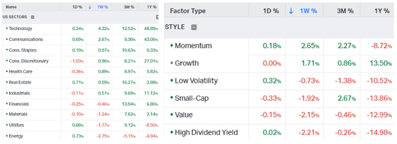 The Nasdaq outperformed the S&P and Russell on the week. Technology, Communication, and Consumer Discretionary were the best-performing sectors, while Momentum, Growth, and Low Volatility were the best-performing factors. Large-cap Growth was the best-performing size/value combo of the week.