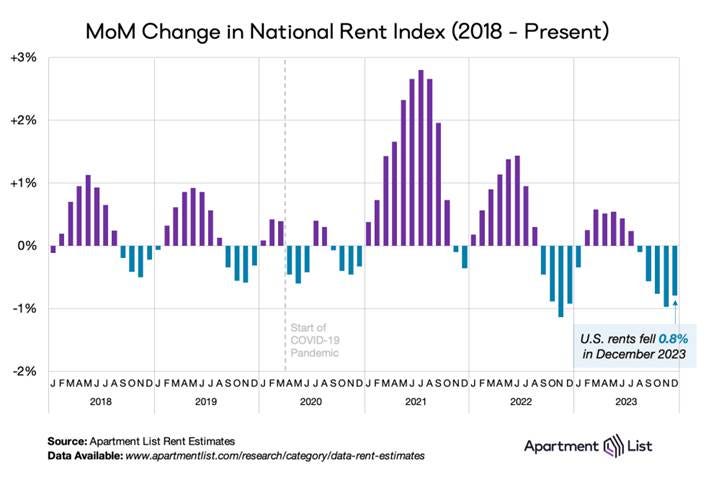 The Apartment List National Rent Report showed that the rental market ended 2023 with a fifth straight month of negative rent growth nationwide, with median rent falling by 0.8% in December.