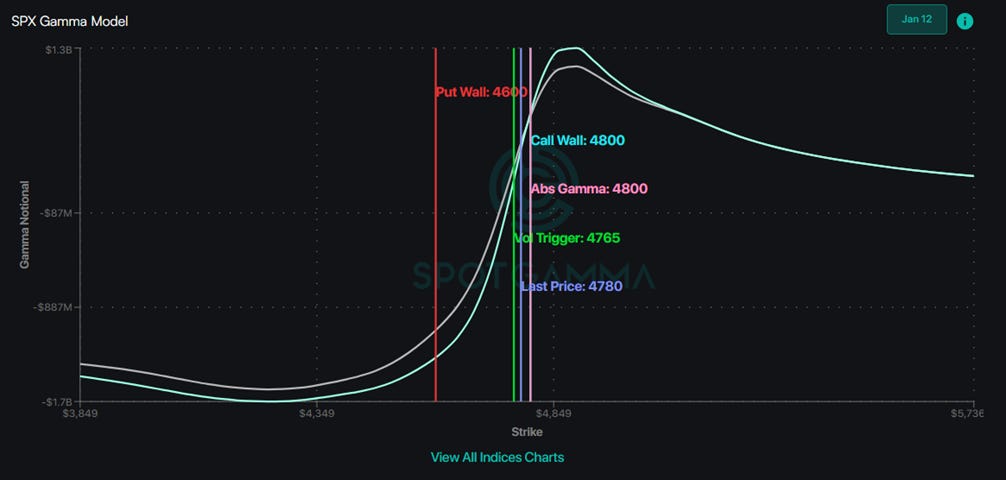 S&P optionality strike levels have the Zero-Gamma Level at 4752 while the Call Wall is 4800 and the Put Wall is 4600. January’s OPEX is setting up to be a major event, with the expiration of large long call positions likely pulling the market lower by mid to late January. Implied volatility remains muted despite recent equity market weakness, with a surge in demand for long volatility (i.e. put buying) as a potential driver of equity weakness moving forward. Until then, the S&P remains in a 4,770 - 4,800 zone, one it has been unable to break above or fall too far from for nearly a month, and the large positive gamma in the strike zone supports this mean-reverting action we've seen.