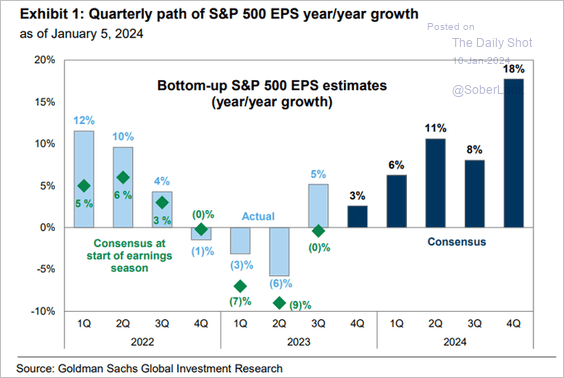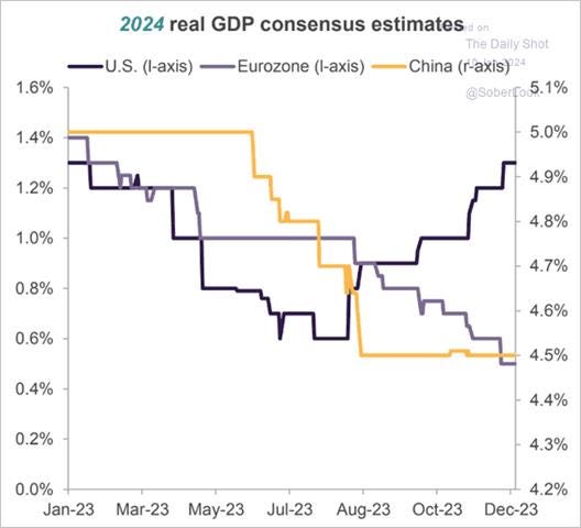 Expectations for U.S. growth in 2024 have been rising, while EZ and China have been declining and flat.