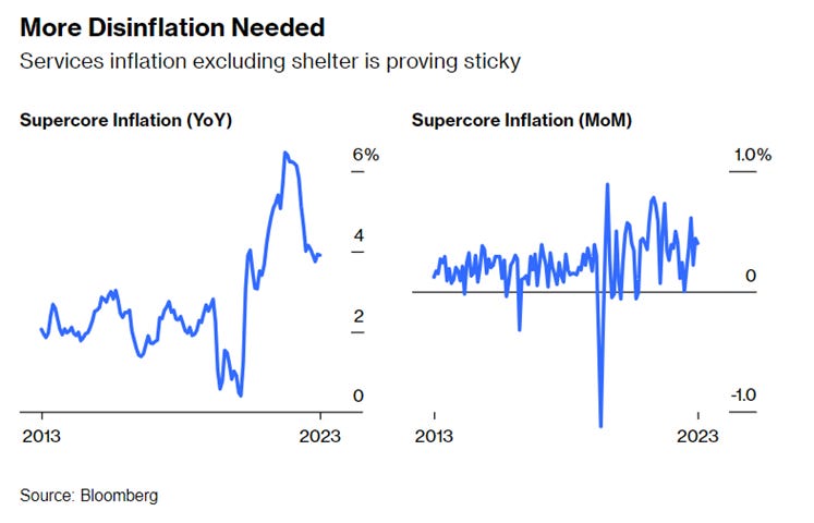 *Disinflationary progress has stalled, and wage pressures could remain stickier than initially thought even as hiring slows, delaying the Fed’s pivot