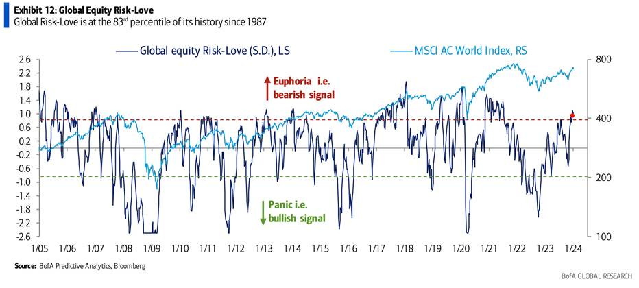 "Global Equity Risk-Love, our contrarian sentiment indicator for equities, has moved from near-panic (25th percentile) in October to euphoria now." – BofA