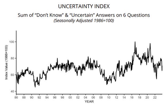 Key Takeaways: The headline optimism index was driven higher by improved readings for expected sales, earnings trends, and general expectations for the economy to improve. Hiring plans and inventory sentiment became more negative, while capex activity and credit conditions were slightly better. Despite better expectations for sales, the net percentage of owners raising their average selling prices was unchanged. Inflation (23) replaced a lack of qualified labor to hire (20) as small business owners’ top concern, followed by taxes (17). The uncertainty index retraced half of its dramatic drop in November but still looks to be trending lower. The commentary in the report was still very negative. NFIB Chief Economist Bill Dunkelberg said, “Small business owners remain very pessimistic about economic prospects this year.”