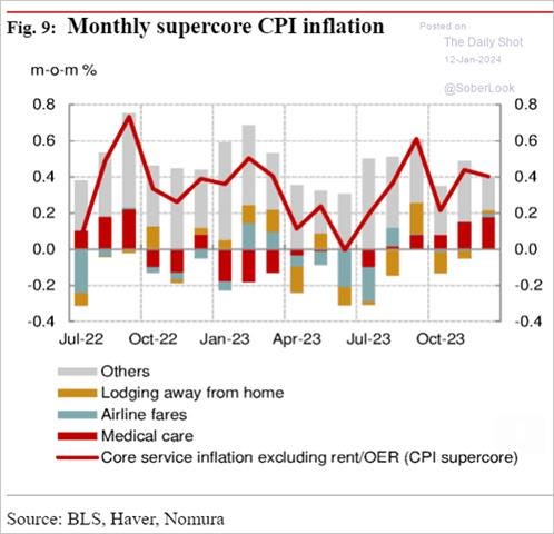 *The Fed’s favorite sub-measure of inflation, supercore, has not been making any progress, while there was a broader number of CPI components rising over 0.2% MoM in December than in November