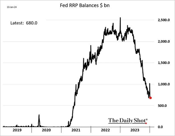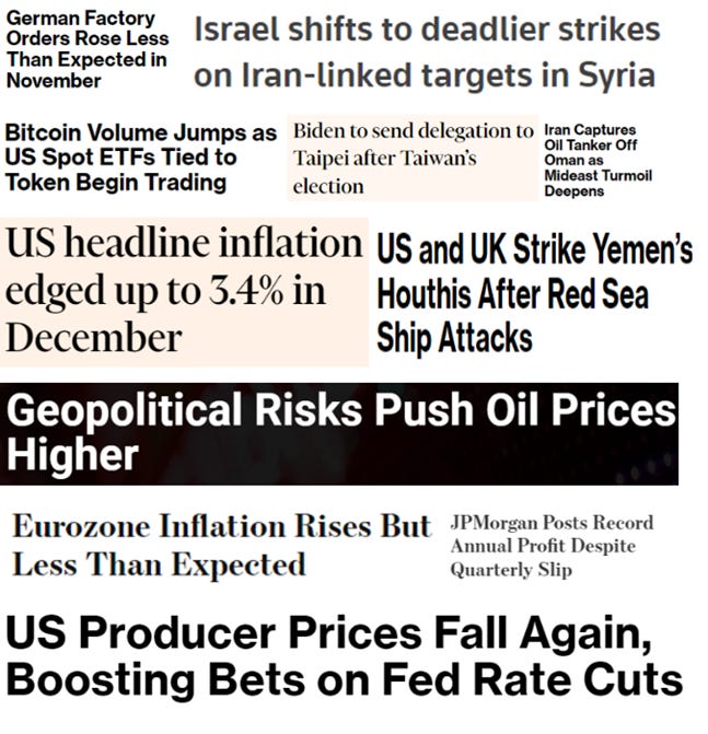 WTI Oil is ending the week little changed, falling from recent highs this morning after the U.S. and U.K. hit Houthi military targets overnight. It traded in a wide range this week due to a barrage of geopolitical headlines and a larger-than-expected reported EIA inventory build. Earlier in the week, Saudi Arabia cut its selling price to Asian customers amid rising supply, growing competition from rival suppliers, and demand concerns. Meanwhile, U.S. oil production remains near record levels, with weekly exports at a fresh high as the Red Sea crisis and the resulting run-up in costs for diverting tankers have driven up demand for cheaper American crude. Elsewhere, Libyan refineries were threatened by protests. Copper was lower on the week, trending lower since late December as traders ignored the growing supply deficit concerns. Overall, industrial metals have been sluggish in 2024, with iron ore falling notably in China due to excess supply concerns. Markets continue to wonder if Beijing will truly commit to stimulating their economy with “out-of-the-box” measures (week ??? of talking about this). The domestic equity market there were inclined to say no, with Chinese equities hitting a five-year low this week. This, on top of a bleak World Bank growth assessment for 2024, has cyclical commodity plays more challenged this week. The agg complex was slightly lower, with today’s WASDE report weighing on corn, beans, and wheat, although all are rebounding earlier losses. The dollar continues to consolidate, with the $DXY little changed on the week, ending near 102.4, despite talks of ending QT and inline inflation reports. The Euro outperformed due to better disinflationary progress, while the Yen was slightly weaker.