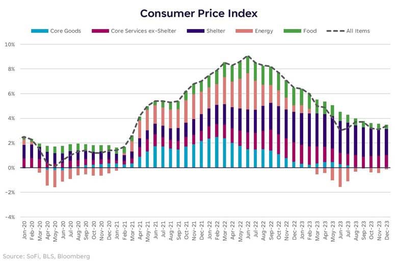 Key Takeaways: Headline CPI came in slightly higher than expected with supercore services, the sub-cut the Fed has stressed, not materially improving. The fact that it has actually picked up in recent months after softer reading in the spring and early summer does not bode well for the Fed who wants to get inflation back to target in a timely manner. Effectively, the disinflationary process is losing steam. Shelter costs contributed over half the overall increase and accelerated slightly in December despite what was expected and seen in private surveys.The BLS’s methodology for shelter inflation tends to be seriously lagged, meaning it is likely overstating rental inflation. That’s important because CPI excluding shelter is back below 2%. The Cleveland Fed’s Median and Trimmed Mean CPI measures increased by 0.4% and 0.3% in December, the same rate as in November, moving the annual readings slightly lower to 5.1% and 3.9% (vs. 5.2% and 4% in the prior month). The Atlanta Fed’s Sticky-Price CPI increased by 4.6% on an annualized basis in December, rising from a 3.6% increase in November. The Flexible Cut of the CPI (a weighted basket of items that change price relatively frequently) increased 3.3% on an annualized basis in December, rising to 0.4% on a year-over-year basis. These separate measures confirm that the disinflation process is having trouble with the last mile (3% to 2%). As a result, the December CPI report was a disappointment but not a game changer for the Fed, confirming that the “last mile” will take some time and that patience is required. Pimco’s economist Tiffany Wilding summed it up well when she said, “The deflationary impulse from normalizing supply chains is a tailwind that will eventually fade. Shelter inflation continues to slowly cool, and services ex-shelter inflation remains sticky — supported by still-elevated wage growth. We think this backdrop is likely to mean that disinflation, which was incredibly fast by historical standards in 2023, could be slower and more complicated in 2024.”