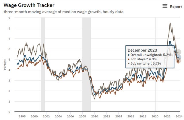 The Atlanta Fed’s Wage Growth Tracker was unchanged for a third month at 5.2% in December. Job changers experienced a 5.7% annual wage increase, the same as in November, while those not changing jobs moved higher to 4.9%, up from 4.6% in November.