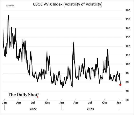 The CBOE VVIX index (vol of vol) has been tumbling, reflecting falling demand for VIX call options.