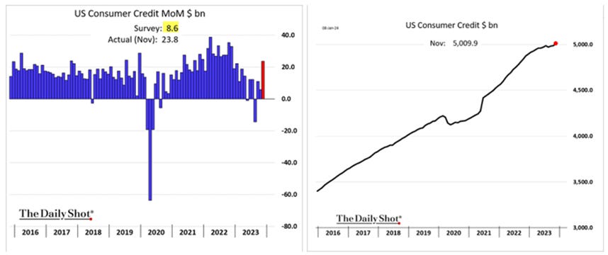 The Board of Governors’s November Consumer Credit Report showed total consumer credit increased by $23.7 billion in November, from a $5.7 billion increase in the previous month and way above market expectation of a $9 billion rise. Revolving credit increased by $19.1 billion, higher by 17.7% on an annual basis. Non Revolving credit increased by $4.6 billion, or 1.5% on an annual basis from the prior month. Both new car loan and credit card plan rates are at a recent high of 8.15% and 21.47%, respectively.