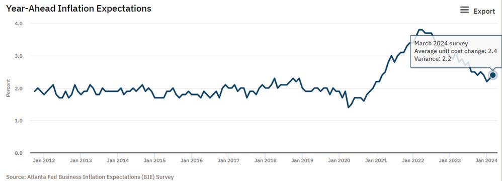 The Atlanta Fed’s year-ahead business inflation expectations remained relatively unchanged at 2.4%, on average. Sales levels and profit margins "compared to normal" remained relatively unchanged over the month. However, year-over-year unit cost growth increased significantly to 2.8%, on average. The quarterly question asked firms' long-term inflation expectations to remain relatively unchanged at 2.8%, on average. The month’s special question asked about firm's expectations for the prime rate, sales revenue, number of employees, and capital expenditure expectations for year-end 2024. They were also asked about their expectations regarding sales revenue, number of employees, and capital expenditures if the borrowing rate is either 2 percent higher or 2 percent lower than their original expectations.