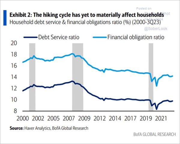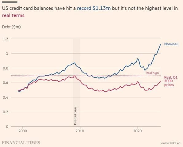 Although increasing, credit card debt levels are not yet at pre=pandemic highs in real terms.