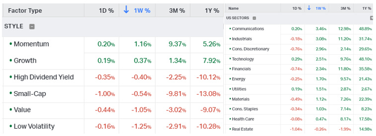 The Nasdaq outperformed the S&P and Russell on the week. Communication, Industrials, and Consumer Discretionary were the best-performing sectors, while Momentum and Growth were the best-performing factors. Large-Cap Growth was the best-performing size/value combo of the week.