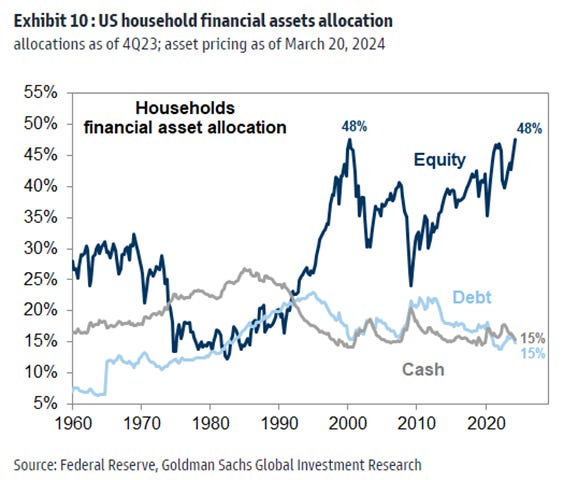 Household equity asset allocation is at record highs, while cash holdings have fallen.