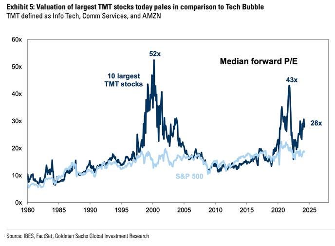 The forward P/E of the 10 largest TMT stocks peaked at 52x in 2000 and 43x in 2021. Today, they trade at “just” 28x forward earnings. – Goldman Sachs