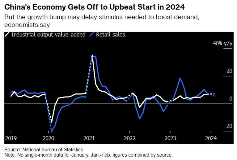 Too Strong: China’s strong factory output and investment growth at the start of the year raised doubts over whether policymakers will step up further support. Industrial output rose 7% in January-February from the same period a year earlier, the fastest in two years and significantly exceeding estimates. Growth in fixed-asset investment accelerated to 4.2%, strongest since April. Retail sales increased 5.5%, roughly in line with projections. “With the recovery in these data, policymakers will likely not see the need to do more than what they plan to do,” said Michelle Lam, Greater China economist at Societe Generale SA. It will take a “much bigger slowdown” for authorities to shift their policy focus to stimulating household income and spending to support consumption, she said. - China’s Growth Bump May Dent Urgency for More Stimulus - Bloomberg