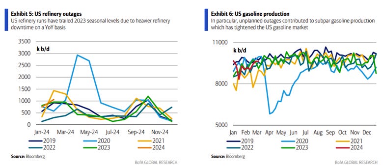 We believe that disruption to gasoline production earlier in the year has largely normalized while rising crack spreads will incentivize greater production due to better profitability. Furthermore, the higher price at the pump is starting to marginally weigh on demand, especially for lower-income cohorts showing greater signs of financial stress. We have a broader view that household consumption will normalize as the labor market becomes balanced, reducing discretionary spending, especially on leisure and hospitality, weighing on the summer driving season. To be clear, this is highly uncertain, and although retail sales have been trending lower and consumer confidence readings look to be losing momentum (likely due to higher gas prices and more neutral views on labor markets), betting against the resilience of the U.S. consumer has been a losing trade. Further, the IEA suddenly revised its global demand forecast to be higher, likely due to the uptick in global manufacturing PMIs. We are less certain this recent acceleration in global activity will have legs, instead seeing it as a restocking after a stronger holiday period. Firms will likely continue to be cautious about normalizing inventories due to uncertain demand moving forward. Turning to geopolitics, it does look like a ceasefire is possible, which may reduce tensions in the region, especially in the Red Sea. Specific to Russia, despite the attacks on energy infrastructure, lower refining capacity would lead to greater crude oil exports, helping keep net energy exports flat. As a result, we think the geopolitical risk premium is near its tactical high. Putting it all together, we have U.S. refiners more incentivized to increase gasoline production into what we view as a potentially overly exuberant domestic demand outlook. The resumption of production at the BP Whiting refinery will make a material difference. Globally, an excess supply balance in the oil market could materialize quickly, especially if OPEC+ loosens its quota stance and further production comes online in various countries, something we could envision with prices at current levels. Asia refineries are going into turnaround, and crack spreads there have been cooling, both reducing their ability and incentives to increase production. Nevertheless, inventories are high, and shipping costs may decline if a peace deal is reached, reducing global prices even if our view on demand cooling is wrong. To be clear, our short position on gasoline through RBOB futures is a contrarian trade, and we are betting against momentum, with technicals indicating an overbought condition. However, we think there should be a tactical correction and look to capture a 5-10% pull back in the next weeks.