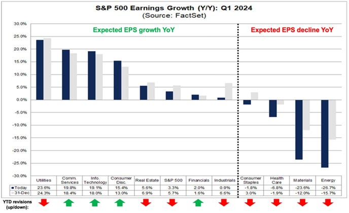 Seven sectors are expected to see EPS growth in Q1. Of those sectors, four (Comm. Svcs., Discretionary, Tech, and Financials) have seen positive YTD earnings revisions. – Factset