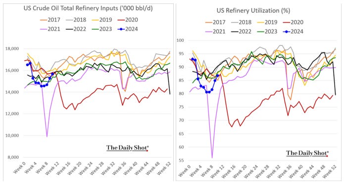 *U.S. refinery inputs are rising, and capacity utilization is moving higher, increasing production levels and future supply
