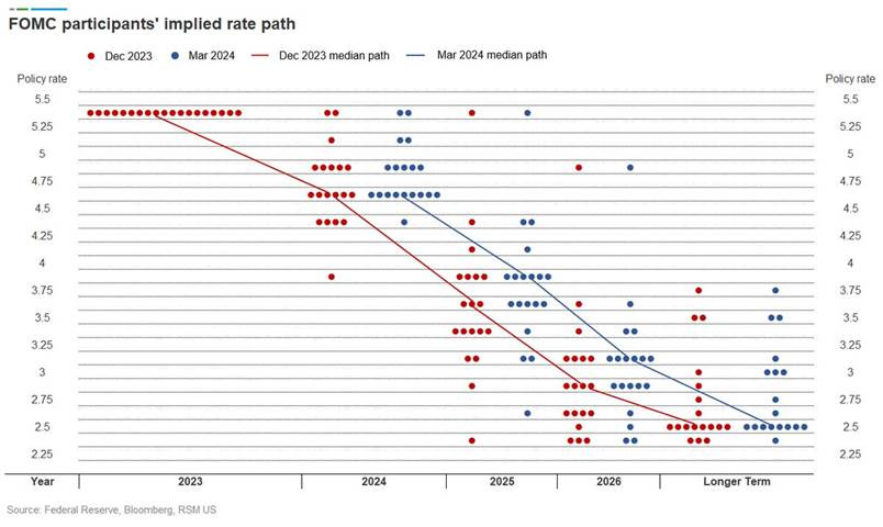 The FOMC left the Fed funds target rate range unchanged at 5.25-5.5% at their March meeting and continued to indicate that three 25bp rate cuts are the most likely path ahead for 2024 in their updated Summary of Economic Projections. There was only one major change in the official statement, changing “…moderated since early last year but remain” with “remained” when describing U.S. job gains. Despite no change to the median estimate for the Fed funds rate at the end of 2024, there was a change in the distribution of expectations, with nine members lined up behind three cuts versus six in December and five expecting more than three cuts. One dot also shifted from two to one, so the median was very close to moving to an expectation for two cuts instead of three on the year. If we use the mean rather than the median, it rose by 11 basis points to 4.81%, which implies that two cuts from here are more likely than one. The forecasted levels of GDP growth over the next three years materially moved higher, with this year now moving to 2.1% from 1.4%, while the unemployment rate for 2024 and 2026 rose slightly. Finally, headline PCE inflation remained the same while core PCE for this year shifted slightly higher to 2.6%.