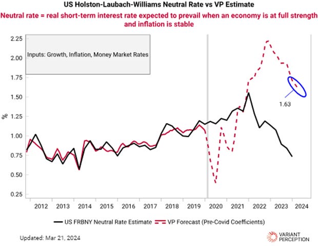 Today, our real neutral rate model is at 1.6%. Again using the Fed's YE 2024 PCE projection (still 2.4%), this implies a nominal policy rate of 4%, while Jan 25 Fed funds futures currently imply 4.5%. This suggests the market may now be underestimating the amount of cuts coming from the Fed the rest of the year. - @Variant Perception