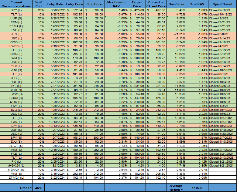 Putting it all together and focusing on what the Fed told us this week, hotter-than-hoped-for inflation readings this year aren’t bothering Fed officials as much as feared. Had Powell wanted to send a more hawkish message, he would have emphasized the increase in inflation forecasts rather than characterized recent higher readings as “bumps.” Powell also stressed that the dots aren’t a contractual commitment, and as we have seen, their predictive track record has been very poor. Further, the disconnect between stronger growth forecasts and still stable headline inflation and UER views shows Fed officials will be more responsive to weaker economic data, especially regarding labor markets, than hotter inflation data, altering the policy reaction function skew. As a result, the risk, in our view, is that the market is underpricing the number of cuts coming this cycle. Consumer spending is cooling by many measures, and the tailwinds that households had coming out of the pandemic in the form of a tight labor market and excess savings are fading. The recent better-than-expected economic activity driven by housing market activity could continue due to the structural supply shortage there but is not necessarily indicating a cyclical pick-up in demand from increased household formation. Further, this activity could be countered by reduced private and public fixed asset investment as firms increasingly become more defensive with capex plans in many industries. Overall, risk assets seem to be priced to perfection, with sentiment extremely bullish and positioning increasingly stretched. There looks to be an assumption that above-trend growth will continue based on supply-side improvements, and a soft landing is all but guaranteed. Instead, we believe that the effects of the tighter policy will increasingly weigh on domestic activity (increasingly through looser labor markets, as discussed) while the global backdrop is not rebounding as materially as many think and is fraught with geopolitical risks. As a result, earnings growth forecasts are too high (even with AI and greater productivity and increased cost-cutting initiatives in vogue), and we believe that although an outright recession may still be quarters away, equities and credit should reflect a more somber outlook. However, with the Fed increasingly taking a more two-sided risk management approach to its policy reaction function, any pullback in risk assets due to a deterioration in economic activity will be floored by increased easing expectations. This leaves us still tactically defensive, expressed through our short Russell index position and, to a lesser extent, our gasoline futures short (which we elaborate further on below). We closed our long Chinese equity and copper positions this week, given our worry that momentum has been lost there due to a more murky narrative. The high level of uncertainty regarding domestic stimulus effects and geopolitical risks makes us want to clip tactical gains when dealing with China quickly. We have also closed our long Euro position with a slight gain given the more dovish stance of the ECB expressed recently and weaker economic data persisting in February. Finally, we are adding a long two-year Treasury position through the June T-Note future (ZTM2024). This adds to our more defensive tactical bias currently, and we believe yields will fall more in the front end, given the views on the Fed we have expressed.