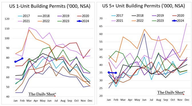 Key Takeaways: Homebuilding continues to be supported by a historically low level of existing homes for sale due to most homeowners being locked into lower mortgage rates and less incentivized to sell/move. Recent better-than-expected activity has also been supported by the average rate on the popular 30-year fixed-rate mortgage falling in recent weeks after flirting with the 7% level in late February. As a result of the combo of lower rates and expectations for further drops as well as low inventory levels persisting, the number of single-house permits reached a one-and-a-half-year high in February. Builders are also cutting prices, offering other incentives to increase sales, and reducing the size of the homes being built to manage higher material costs. "Single-family starts could remain strong in the next couple of months as builders continue to see demand for new builds despite the headwinds facing buyers," said Daniel Vielhaber, an economist at Nationwide. "Rate incentives from builders continue to help buyers afford homes on the new side of the market."